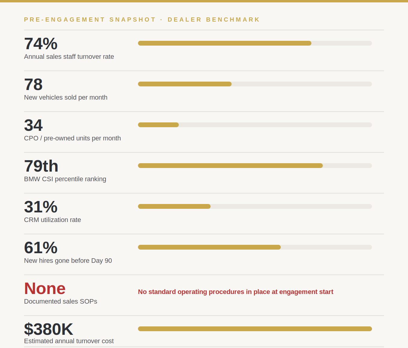 * Client identity has been anonymized to protect confidentiality. All performance figures represent actual results from this engagement. Industry benchmarks referenced from NADA 20 Group data, Cox Automotive Dealership Staffing Study, and BMW of North America performance reporting. Individual results will vary by market, store size, and engagement scope.