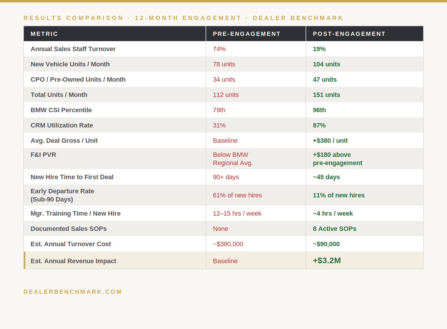At the conclusion of the 12-month engagement, Dealer Benchmark conducted a full post-assessment review against the pre-engagement baseline. The data reflected a fundamentally different operation.