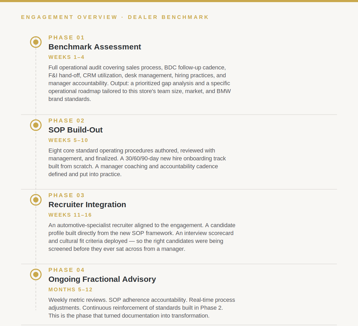 With the assessment complete, Dealer Benchmark moved into an active Fractional Dealer Advisor engagement. The work was structured into four phases, each with defined deliverables and built-in accountability.