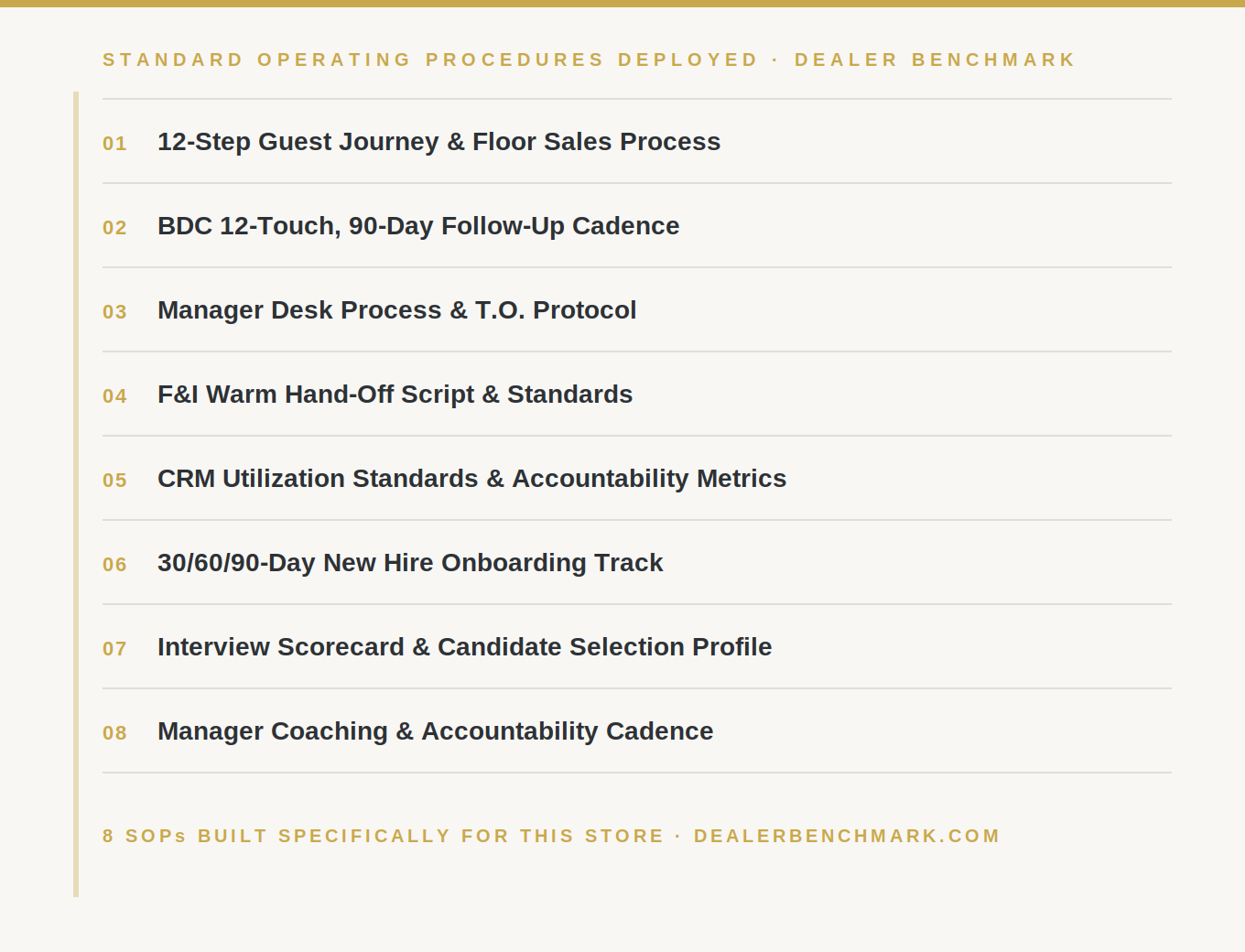 A Benchmark Assessment is Dealer Benchmark's diagnostic engagement — a full floor-up evaluation of a dealership's sales process, BDC, F&I, CRM, desk management, hiring practices, and manager accountability. The output is a prioritized gap analysis and a specific operational roadmap built around that store's team and market.